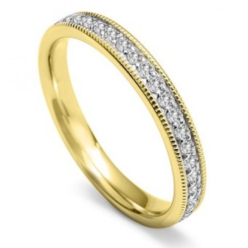A unique, beautifully crafted design, consisting of a milgrain design with a beaded edge, with 40 % set round brilliant cut diamonds, to give a delicate and feminine look. The perfect complement to a vintage-look engagement ring.