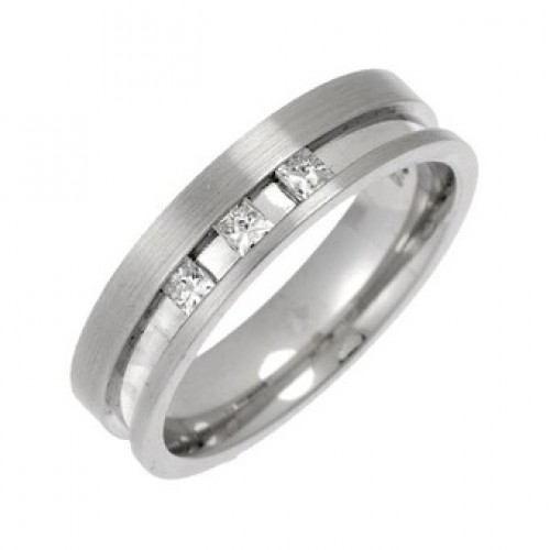 A 5mm flat court diamond set wedding band with a matt finish, this unique ring is set with three princess cut diamonds in a semi tension set setting.