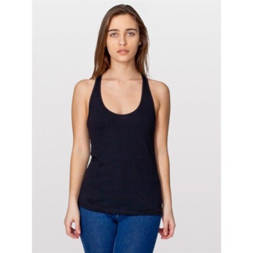 RSA2329 American Apparel Fine Jersey Racerback Tank. A casual tank with generously cut arm openings and a sporty yet feminine racerback. 100% Fine Jersey cotton construction. Racerback. Form-fitting.