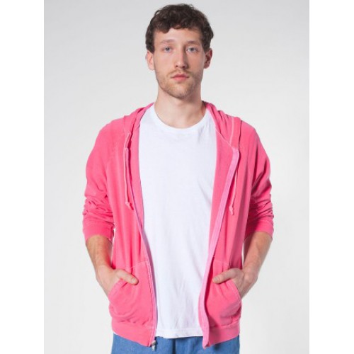 American Apparel Adult's Highlighter California Hooded Sweatshirt. Just like our classic drawstring pullover hoody, but with a zipper. Now in fluorescent colors. 100% California Fleece cotton construction. Matching Nylon zipper. Hooded with matching knotted Cotton drawcord. Raglan sleeves. Kangaroo pocket. Fluorescent colors - machine wash separately.
