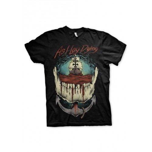 Short sleeved black tee, featuring a round neckline and a large ‘As I Lay Dying’ Sea jaw print in red, white and blue. This is a regular fitting design. • 100% Cotton • Machine washable at 30 degrees