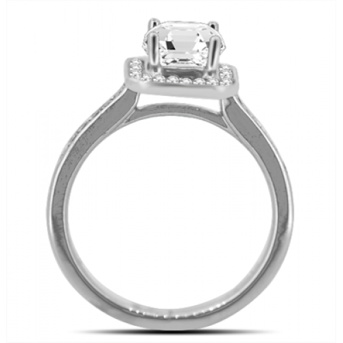 A stunning diamond ring with round brilliant diamonds surrounding the centre princess diamond which is held in four prongs and diamonds delicately placed within the shoulders.