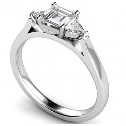 A simple yet striking diamond trilogy ring design. An asscher cut diamond is placed within a central claw setting, with two trillian cut diamonds placed each side of the central setting pointing out in a claw setting, on a court shank. The tapered daylight shoulders ensure maximum light shines through each individual diamond whilst all attention is still drawn to this beautiful diamond trilogy ring. This design ensures a wedding band will fit perfectly next to this beautiful diamond trilogy ring.