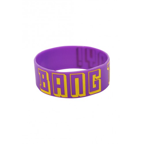 Purple silicone rubber wristband with a ‘Bang Tidy’ graphic in yellow.