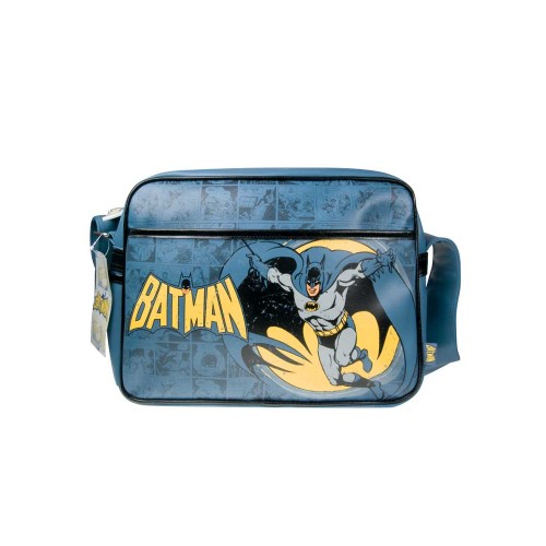 Blue messenger bag featuring a large Batman, Dark Knight front print and white edging. It has a zip fastening, fully adjustable strap and studded feet. Measures approx 36cm x 28cm X 12cm Sponge clean with a damp cloth