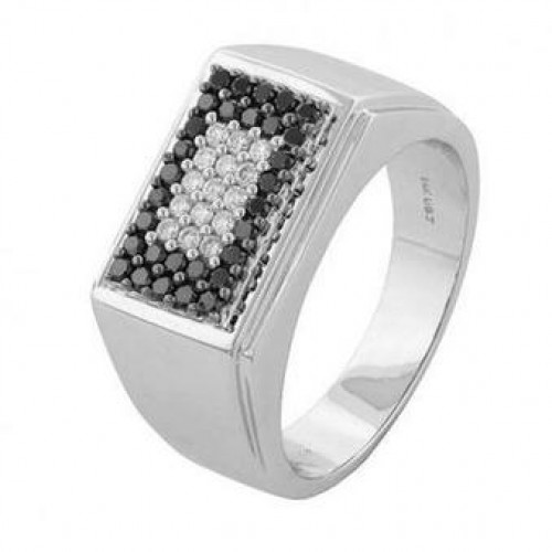 A mens black and white diamond designer ring, with round pave set diamonds.