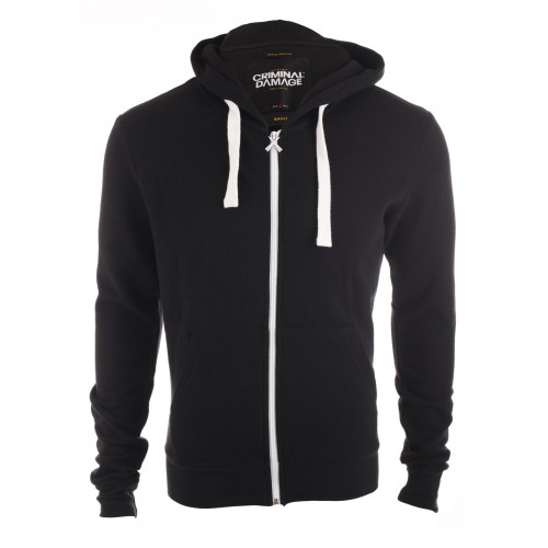 Criminal Damage black, zip through hooded sweatshirt. This jacket is bold in colour with a white zip and drawstring chords in the hood. It has front kangaroo pockets and is a skinny fitting design. 100% Cotton Machine Washable at 30 degrees Available in other colours