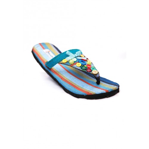 Purple striped flip flops with button embellished strap, recycled tyre sole and hemp upper sole. They are handcrafted Kenya, Africa with the highest quality and fair trade standards in mind. The project was created by Fresh Cargo and Maasai Treads and is a partnership helping both local community people in Nairobi as well as educating around the world the benefits of fair trade and recycled products. Sole Recycled Tyres, Upper: 100% Hemp Clean with a warm damp cloth