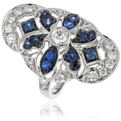 This stunning diamond dress ring features a beautifully designed diamond gemstone ring. With round brilliant cut diamonds and natural blue sapphires in a pave setting.