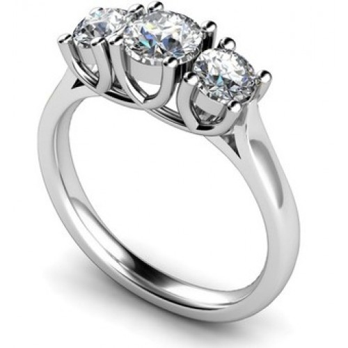 A round diamond trilogy ring. With three graduated round diamonds, set within a crossover setting. The diamonds are mounted on tapered daylight shoulders on a court shank.