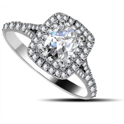 A beautifully crafted double halo design, consisting of a round brilliant cut diamond set in a grain style setting.