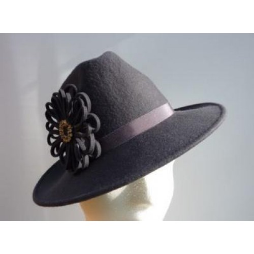 A simple but very stylish trilby in Dark Grey Felt. Trimmed with a coordinating band of petersham around the crown and topped to the right side with a double looped felt flower with Swarovski crystals in Silver Night.