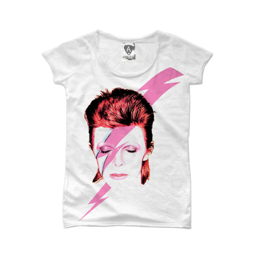 Slim fitting white t shirt featuring a large distressed David Bowie Aladdin Sane print and unique vintage finish. There is a scoop neckline and raw edge detail around the collar, sleeves and bottom hem line. 100% cotton Machine Washable at 30 degrees. Wash inside out