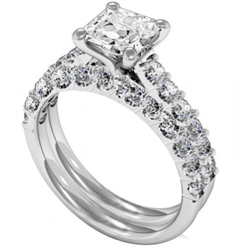 This is a beautiful diamond shoulder set bridal piece. The engagement ring has been made with a central princess cut diamond with round brilliant cut diamonds set on the shoulders of the band. The diamond set wedding band has been made to compliment the shoulders of the engagement ring.