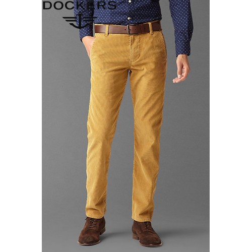 Dockers Alpha Khaki Cord. 100% Cotton Corduroy. Jeans fit sensibility with heavier stitching. Slim Fit. Sits slightly below the waist. Slim through seat and thigh. Tapered leg