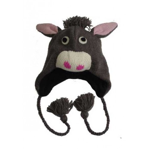 This animal hat was hand knitted in Nepal and features a donkey face design. Its 100% Wool with a soft fleece lining for extra warmth, finished with two plaited ties. A fantastic way of injecting a little fun into your winter wardrobe. Hat 100% Wool Lining 100% Polyester Hand wash separately