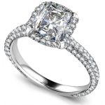A stunning diamond engagement ring, with the centre Cushion diamond held in four prongs and a double halo of smaller round brilliant cuts surrounding the centre diamond upon a plain polished shank.