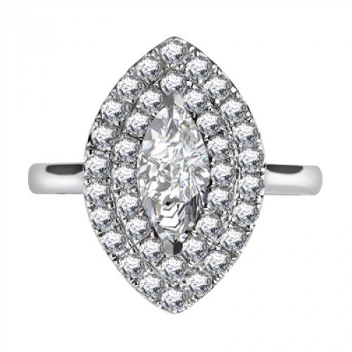 A stunning diamond engagement ring, with the centre marquise diamond held in four prongs and a double halo of smaller round brilliant cuts surrounding the centre diamond upon a plain polished split shank.