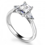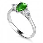 This is a magnificent pear-shaped green emerald trilogy ring , set in a low prong style setting. It can be worn with the centre pear cut diamond facing up or down to give two different looks.