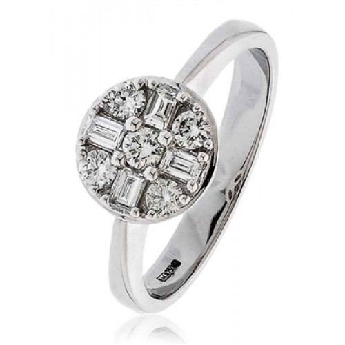 A beautiful diamond cluster ring, with prong set diamonds. Consisting of round and baguette cut diamonds.