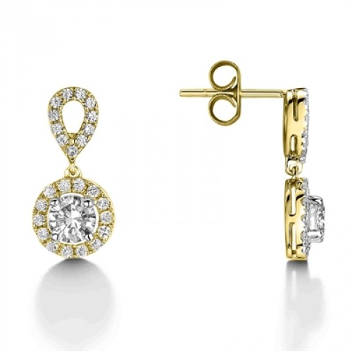 An unusual pair of round diamond halo earrings with one large round brilliant cut diamond held in four prongs surrounded by round diamonds set with small grains.