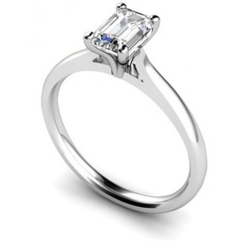 An emerald cut diamond engagement ring. The diamond is set in a round 4 claw setting with tapered daylight shoulders. The diamond is mounted onto a court shank. This design allows a perfect wedding ring fit.,