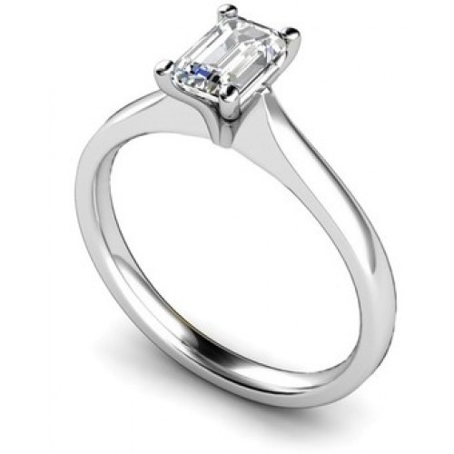 A solitaire diamond engagement ring. The Emerald cut diamond sits within a round 4 claw setting, with tapered solid shoulders, on a court shank.This design allows a perfect wedding ring fit.,