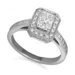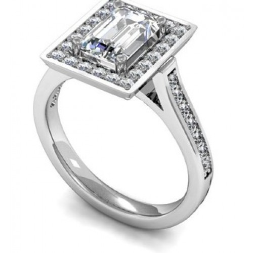 A diamond halo ring with a centre Emerald shaped diamond set in a prong setting, surrounded by small round diamonds.