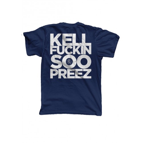 Short sleeved blue tee, featuring a round neckline and a large 'Enter Shikari' print in white and silver on the front and large 'Kell Fuckin Soo Preez' print in white on the back. This is a regular fitting design. • 100% Cotton • Machine washable at 30 degrees