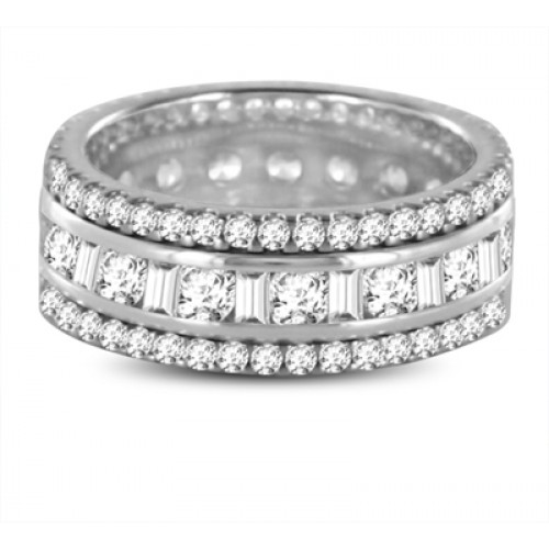 This extravagant diamond full eternity ring is beautifully set with round brilliant cut diamonds in a 3 row setting with channel set round and baguette cut diamonds set the middle row. Approx 7.5mm wide.