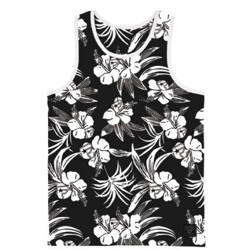 Loose fitting black vest featuring an all over Fambiscus print. Its finished with contrasting white binding around the neck and armholes. 100% Cotton. Machine Washable at 30 degrees.