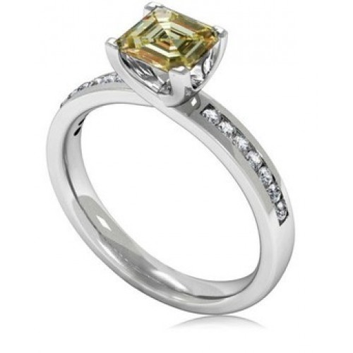 A unique Fancy yellow asscher cut Diamond, set in a four claw setting, with round brilliant cut diamonds channel set on the sides of the shank.