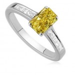 A unique Fancy yellow radiant cut Diamond, set in a four claw setting, with round brilliant cut diamonds channel set on the sides of the shank.