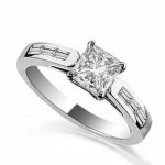 A beautiful diamond side stone ring design. Consisting of a princess cut diamond in a four claw setting, with approximately 10 delicate round cut diamonds set along the band in a channel setting.
