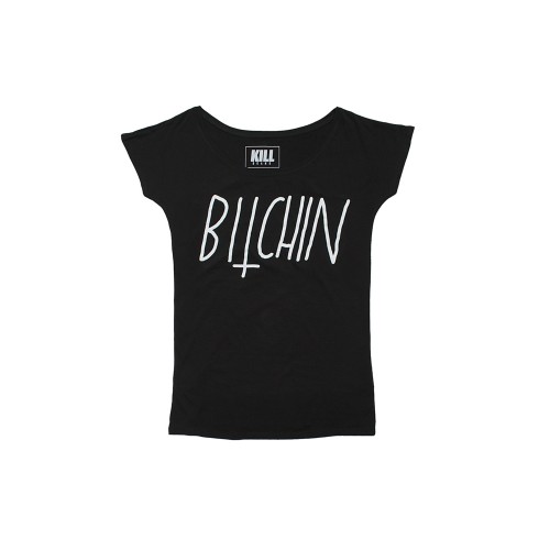 Longline black t shirt featuring a large Bitchin print. Its finished with a scoop neckline. 100% Tencel. Machine Washable at 30 degrees. *PLEASE NOTE – This item is pre-sale and will not be dispatched until 10/07/13