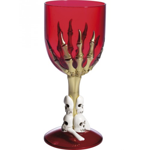 Gothic Wine Glass, Red, with Skeleton hand and Skull Stem, with Label