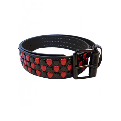 Chaos Brothers black belt featuring three rows of red and black, heart shaped. It comes with a removable belt buckle, which can easily be changed. Wipe Clean with a damp cloth