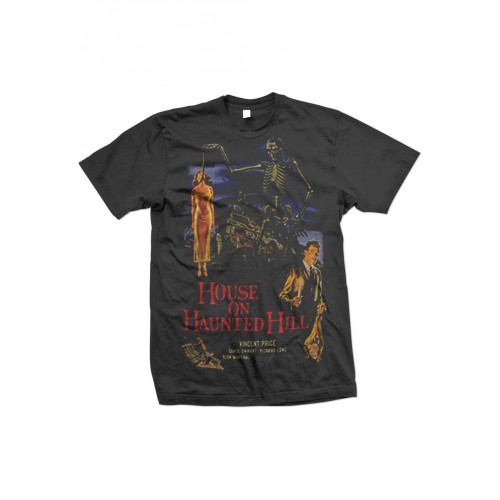 Regular fitting black t shirt featuring a large House on the Haunted Hill print. This is unisex and looks great on guys and girls. 100% cotton. Machine Washable at 30 degrees.