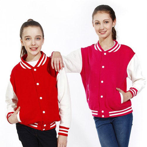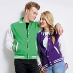 The JH43J is the Just Hoodies Kid's Varsity Jacket. Just Hoodies produces superb quality clothing for kids, so choosing the JH43 makes great sense when picking your kids varsity jacket online. Made from a 330gsm 80% Cotton, 20% Polyester fabric, this garment is comfortable and durable, and also complies with the Worldwide Responsible Accredited Production (WRAP) certified production, giving you the assurance of the lawful, humane and ethical manufacturing of this garment. The Varsity kids jacket has contrast sleeves, a knitted collar, cuffs and waistband with striped details, and press-stud closure with contrast studs. The garment also has welt contrast pockets, a pocket with small opening for an earphone cord feed, hidden earphone loops, a taped back neck, and a hanging loop at back of the neck. This jacket is also suitable for embroidery with your school or club logo. Please ask about your embroidered varsity jacket or embroidered kids jacket requirements.