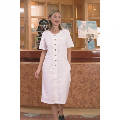 Round Neck , 7 button front, step in dress. Two concealed side seam pockets. Metal coated contrasting “gold” buttons. Welted left breast false pocket. Rear darts for contoured fit. Ideal for beauty & health applications. Made from Klopman’s revolutionary Comfort Stretch fabric for feel and ease of movement. Crease resist finish.8, 10, 12, 14, 16, 18