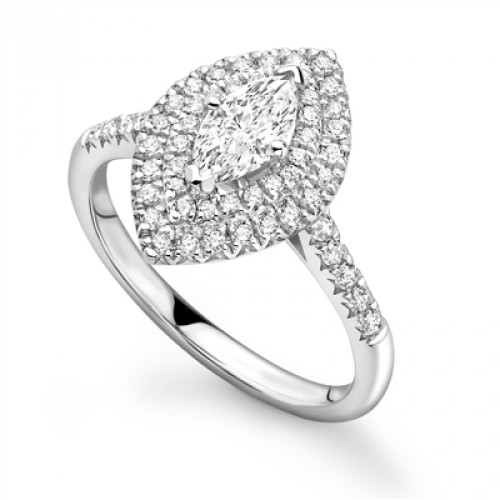 A gorgeous Marquise Diamond Halo shoulder set ring with Round Brilliant cut diamonds placed within the shoulders and around the centre stone in a double halo setting.