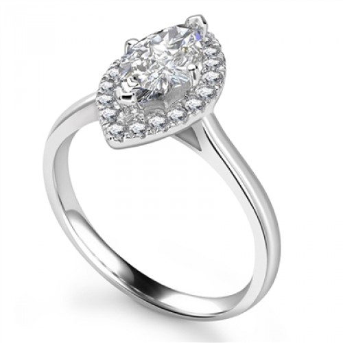 A diamond set single halo ring. With a centre Marquise shaped diamond, surrounded by round brilliant cut diamonds.