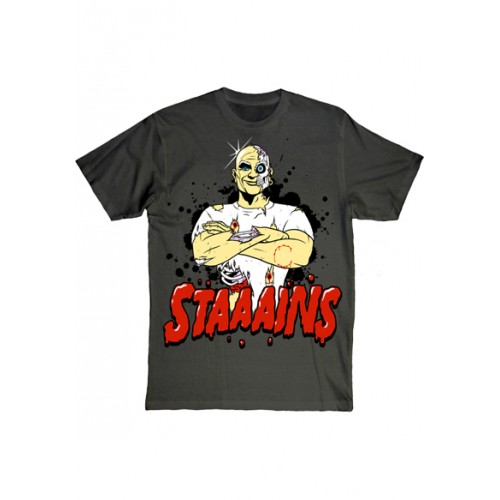 Goodie Two Sleeves grey short sleeved tee. This design features a round neckline and bold Staaainssoft hand screen print. This is a regular fitting design. 100% Cotton. Machine Washable at 30 degrees
