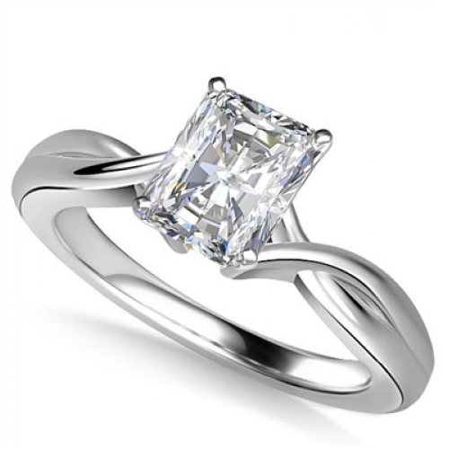 This gorgeous single stone ring has become a popular design with our customers. A radiant cut diamond sits within a 4 claw setting, with the infinity twist plain band.