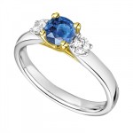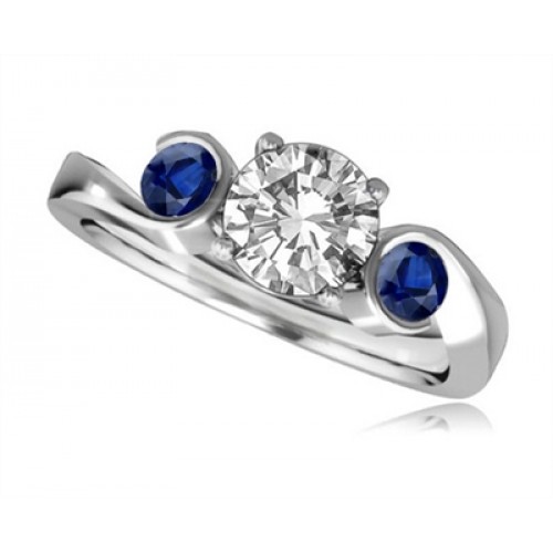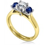 A modern diamond trilogy ring design within our collection, with a centre round brilliant cut diamond and two round blue sapphire. This is a unique design that should not be overlooked.