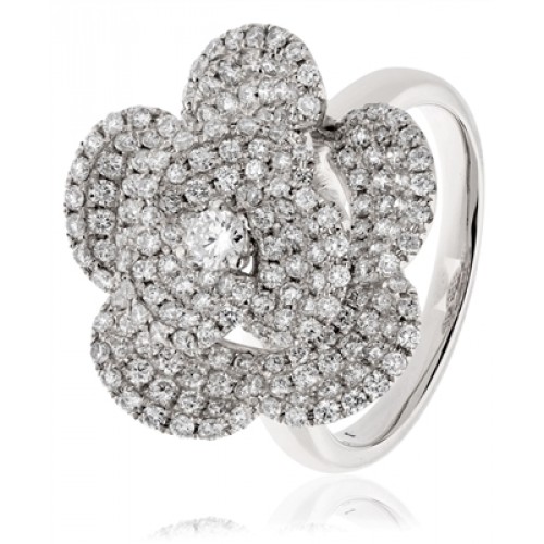 A modern diamond cluster cocktail dress ring, with round brilliant cut diamonds pave set, on a beautiful butterfly setting.
