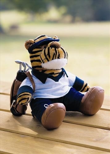 Smartly dressed golfing tiger. Comes dressed in a coloured contrast tee, smart corduroy trousers and matching sun visor. He carries a miniature set of realistic golf clubs.