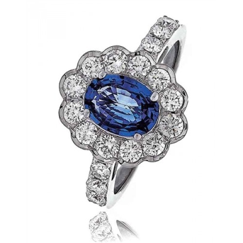 A beautiful diamond gemstone ring. With round an oval shaped blue sapphire set in the centre, surrounded by round brilliant cut diamonds.