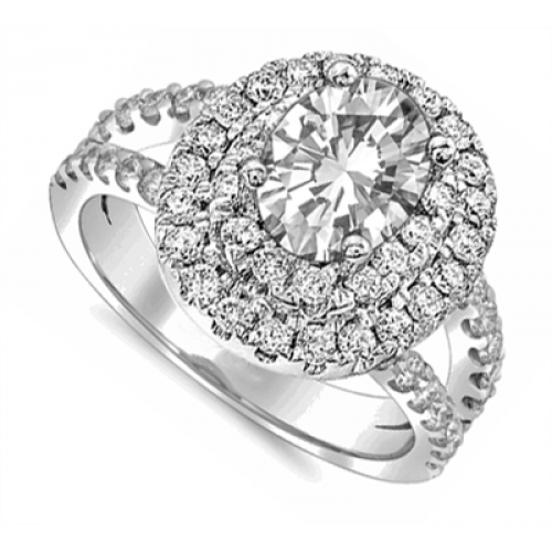 A gorgeous Oval Cut Diamond Cluster shoulder set ring with Round Brilliant cut diamonds placed within the shoulders and around the centre stone in a double halo setting.
