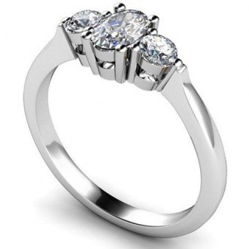A diamond trilogy ring. A large oval cut diamond is placed within a high central claw setting, with two round diamonds placed each side of the central setting in a low claw setting, with solid tapered shoulders on a court shank.